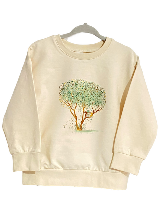 Cotton toddler sweatshirt with tree illustration -Litlle girl reading.